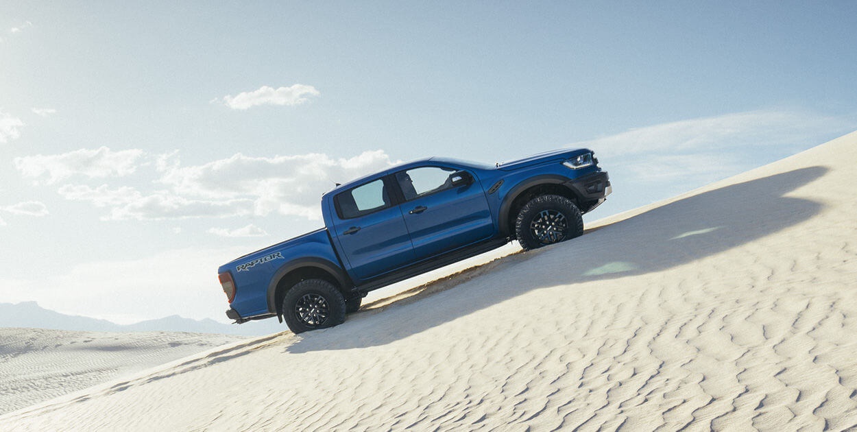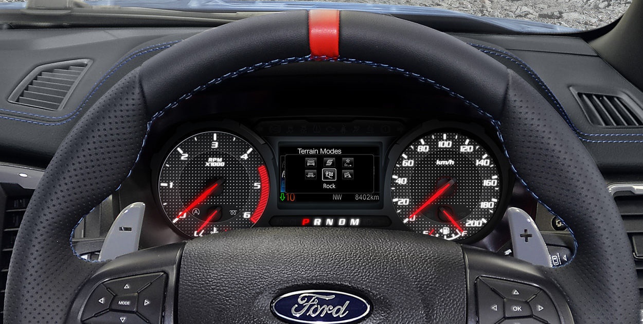 Ranger Raptor’s Terrain Management System (TMS) allows you to excel in a variety of terrains, not just the desert. With just the push of a button on the unique leather steering wheel, drivers can switch between six different modes: Normal, Sport, Grass/Gravel/Snow, Mud/Sand, Rock and last but definitely not least, the off road racing inspired Baja mode!